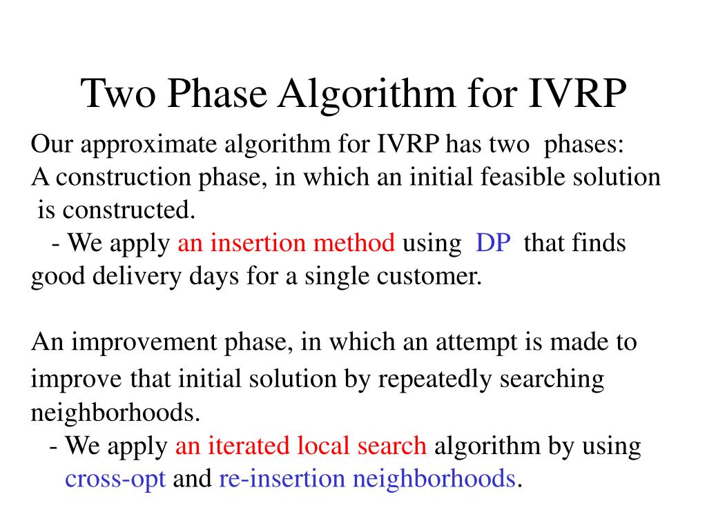 Two Phase Algorithm for IVRP Our approximate algorithm for IVRP has two phases: A construction phase, in which an initial feasible solution is constructed. - We apply an insertion method using DP that finds good delivery days for a single customer. An improvement phase, in which an attempt is made to improvethat initial solution by repeatedly searching neighborhoods. - We apply an iterated local search algorithm by using cross-opt and re-insertion neighborhoods.