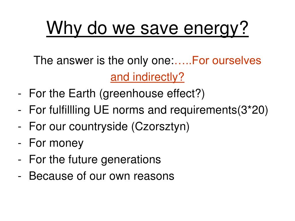 Why do we save energy? The answer is the only one:…..For ourselves and indirectly? • For the Earth (greenhouse effect?) • For fulfillling UE norms and requirements(3*20) • For our countryside (Czorsztyn) • For money • For the future generations • Because of our own reasons