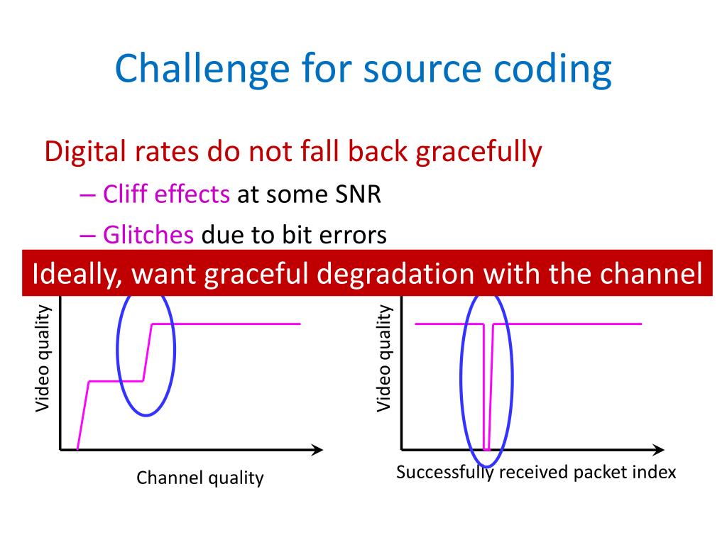 Challenge for source coding Digital rates do not fall back gracefully • Cliff effects at some SNR • Glitches due to bit errors Ideally, want graceful degradation with the channel Video quality Video quality Successfully received packet index Channel quality