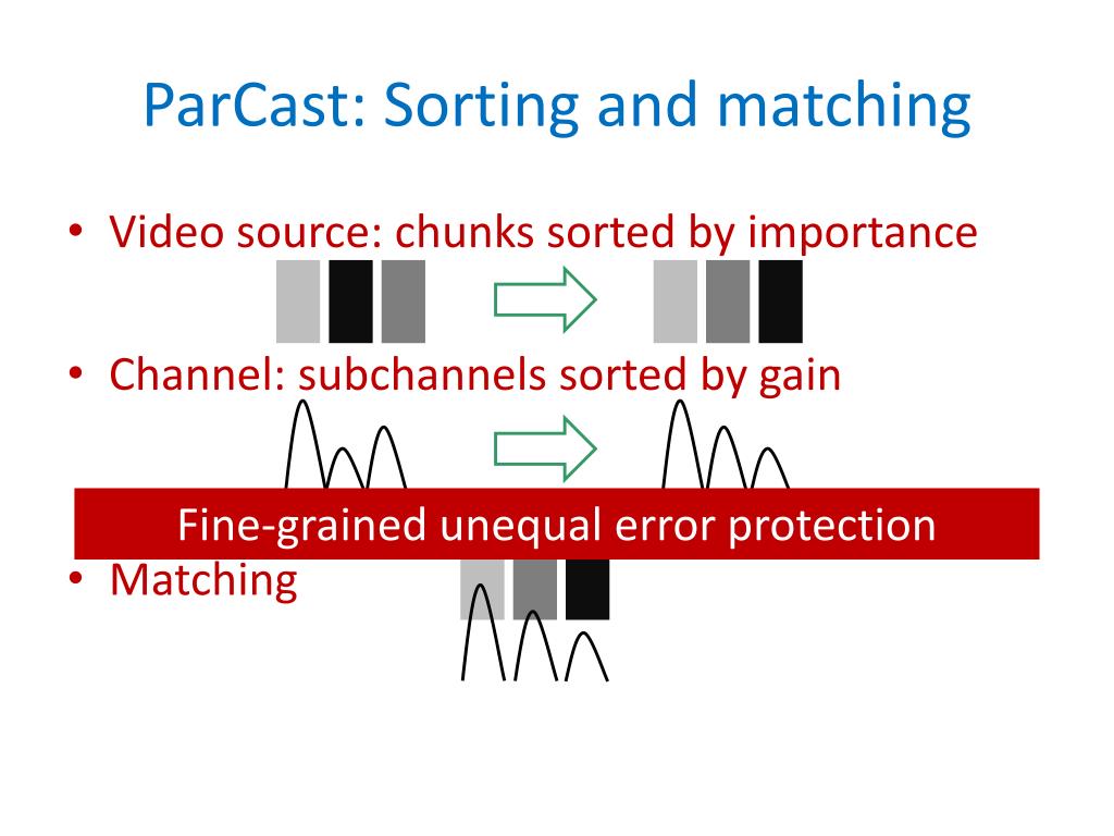 ParCast: Sorting and matching • Video source: chunks sorted by importance • Channel: subchannels sorted by gain • Matching Fine-grained unequal error protection