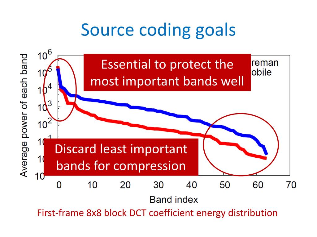 Source coding goals Essential to protect the most important bands well First-frame 8x8 block DCT coefficient energy distribution Discard least important bands for compression
