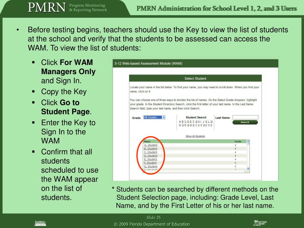 Click For WAM Managers Only and Sign In. Copy the Key Click Go to Student Page. Enter the Key to Sign In to the WAM Confirm that all students scheduled to use the WAM appear on the list of students. • Before testing begins, teachers should use the Key to view the list of students at the school and verify that the students to be assessed can access the WAM. To view the list of students: * Students can be searched by different methods on the Student Selection page, including: Grade Level, Last Name, and by the First Letter of his or her last name.