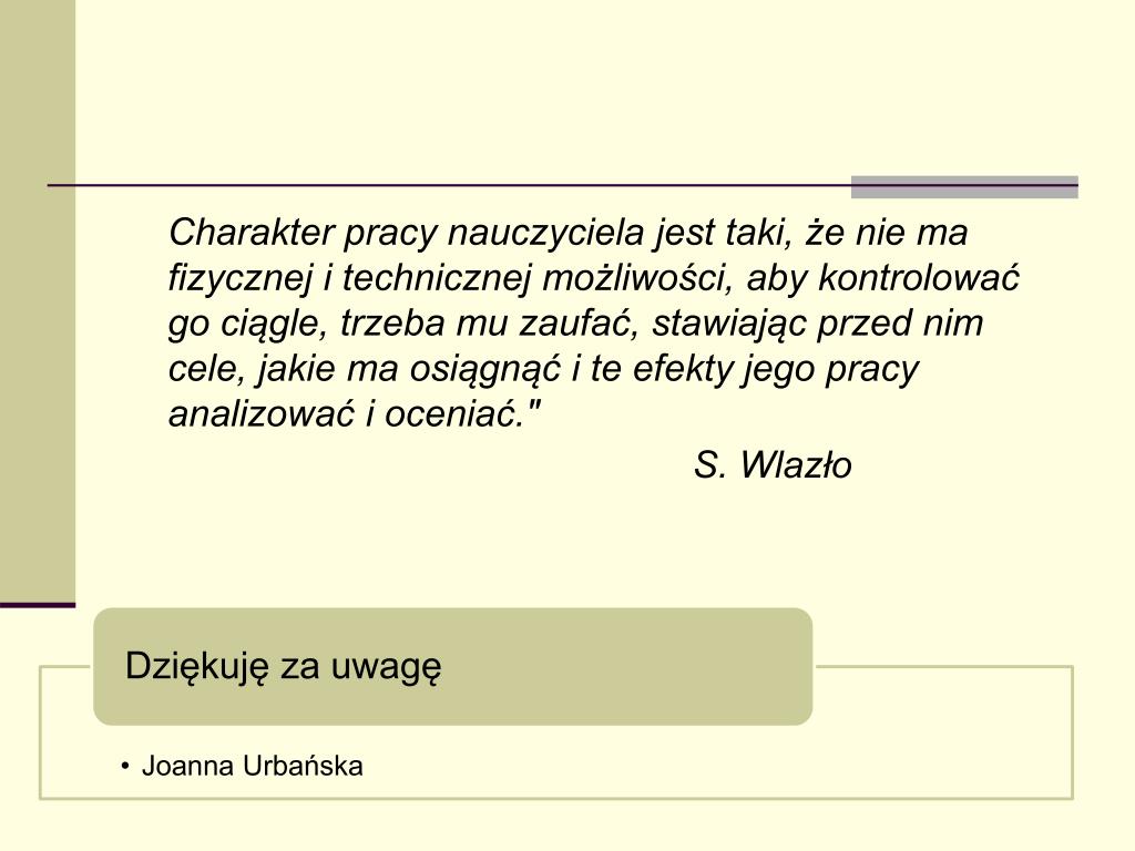 Charakter pracy nauczyciela jest taki, że nie ma fizycznej i technicznej możliwości, aby kontrolować go ciągle, trzeba mu zaufać, stawiając przed nim cele, jakie ma osiągnąć i te efekty jego pracy analizować i oceniać." S. Wlazło