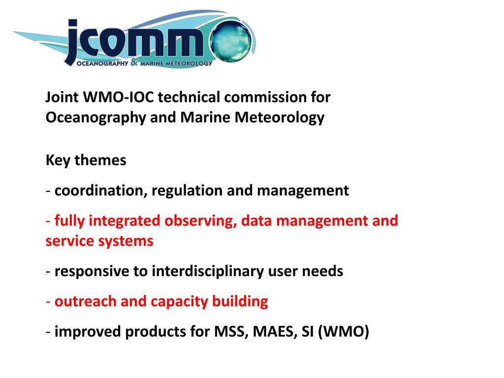 Joint WMO-IOC technical commission for Oceanography and Marine Meteorology • Key themes • coordination, regulation and management • fully integrated observing, data management and service systems • responsive to interdisciplinary user needs • outreach and capacity building • improved products for MSS, MAES, SI (WMO) Real-time system