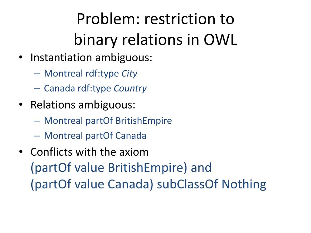 Problem: restriction to binary relations in OWL • Instantiation ambiguous: • Montreal rdf:typeCity • Canada rdf:typeCountry • Relations ambiguous: • Montreal partOfBritishEmpire • Montreal partOf Canada • Conflicts with the axiom (partOfvalue BritishEmpire) and (partOf value Canada) subClassOf Nothing
