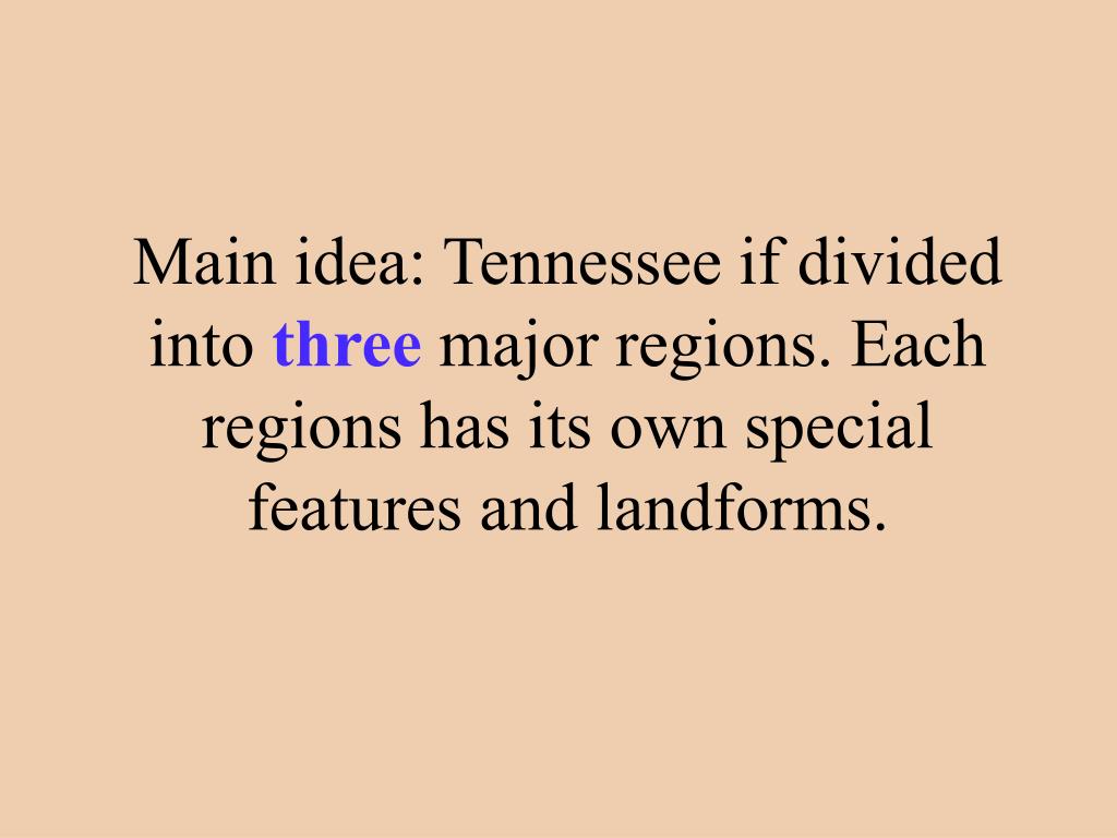 Main idea: Tennessee if divided into three major regions. Each regions has its own special features and landforms.
