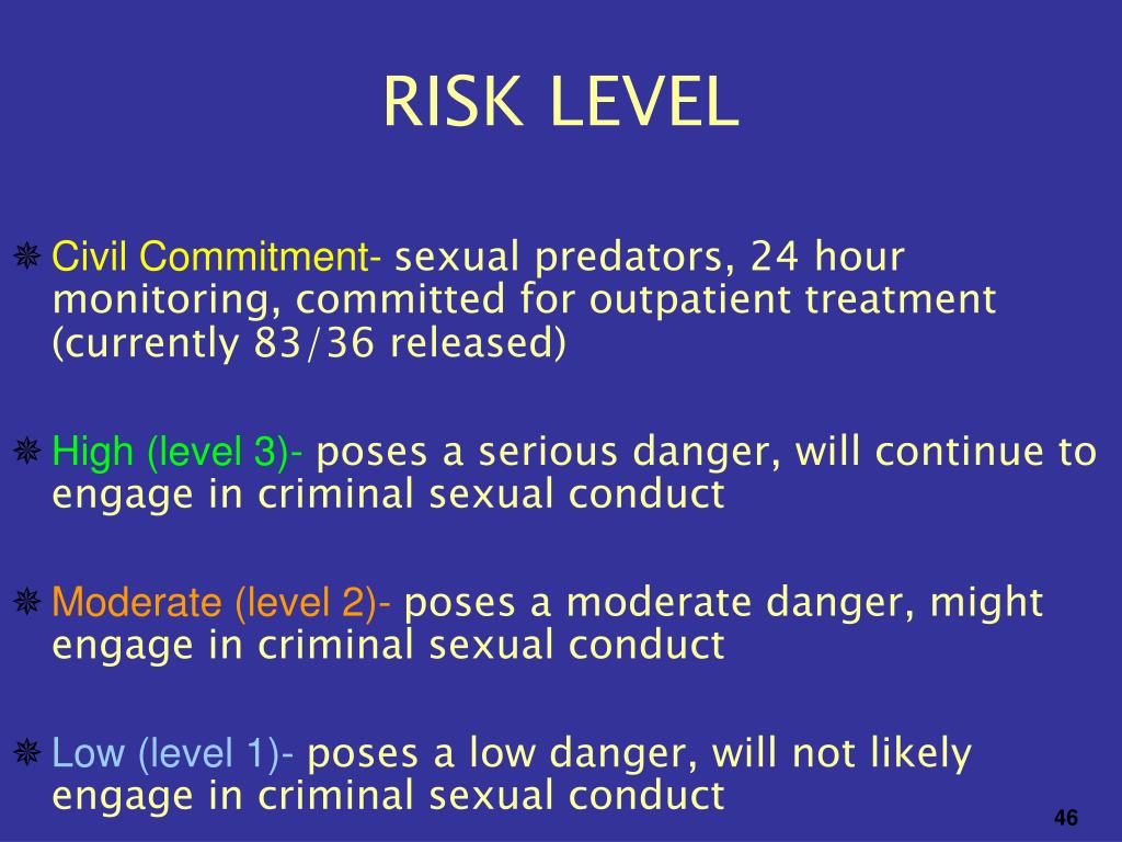RISK LEVEL • Civil Commitment-sexual predators, 24 hour monitoring, committed for outpatient treatment (currently 83/36released) • High (level 3)-poses a serious danger, will continue to engage in criminal sexual conduct • Moderate (level 2)-poses a moderate danger, might engage in criminal sexual conduct • Low (level 1)-poses a low danger, will not likely engage in criminal sexual conduct 46