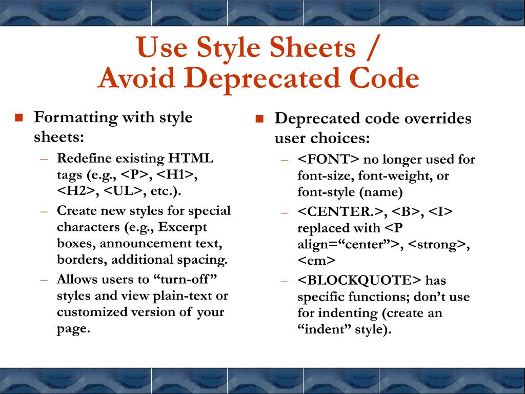 Formatting with style sheets: Redefine existing HTML tags (e.g., <P>, <H1>, <H2>, <UL>, etc.). Create new styles for special characters (e.g., Excerpt boxes, announcement text, borders, additional spacing. Allows users to “turn-off” styles and view plain-text or customized version of your page. Deprecated code overrides user choices: <FONT> no longer used for font-size, font-weight, or font-style (name) <CENTER.>, <B>, <I> replaced with <P align=“center”>, <strong>, <em> <BLOCKQUOTE> has specific functions; don’t use for indenting (create an “indent” style). Use Style Sheets / Avoid Deprecated Code