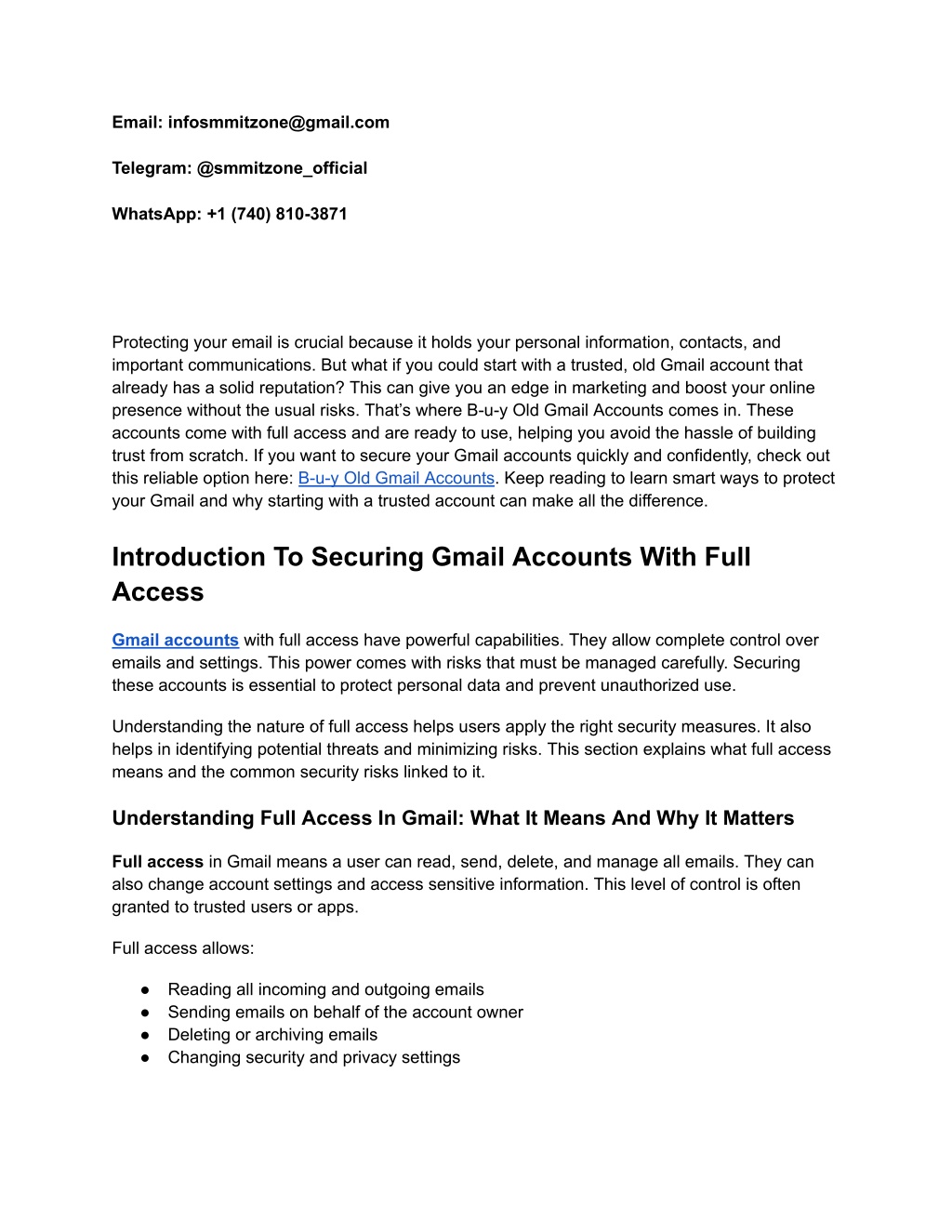 Email: infosmmitzone@gmail.com Telegram: @smmitzone_official WhatsApp: +1 (740) 810-3871 Protecting your email is crucial because it holds your personal information, contacts, and important communications. But what if you could start with a trusted, old Gmail account that already has a solid reputation? This can give you an edge in marketing and boost your online presence without the usual risks. That’s where B-u-y Old Gmail Accounts comes in. These accounts come with full access and are ready to use, helping you avoid the hassle of building trust from scratch. If you want to secure your Gmail accounts quickly and confidently, check out this reliable option here: B-u-y Old Gmail Accounts. Keep reading to learn smart ways to protect your Gmail and why starting with a trusted account can make all the difference. Introduction To Securing Gmail Accounts With Full Access Gmail accounts with full access have powerful capabilities. They allow complete control over emails and settings. This power comes with risks that must be managed carefully. Securing these accounts is essential to protect personal data and prevent unauthorized use. Understanding the nature of full access helps users apply the right security measures. It also helps in identifying potential threats and minimizing risks. This section explains what full access means and the common security risks linked to it. Understanding Full Access In Gmail: What It Means And Why It Matters Full access in Gmail means a user can read, send, delete, and manage all emails. They can also change account settings and access sensitive information. This level of control is often granted to trusted users or apps. Full access allows: ● Reading all incoming and outgoing emails ● Sending emails on behalf of the account owner ● Deleting or archiving emails ● Changing security and privacy settings