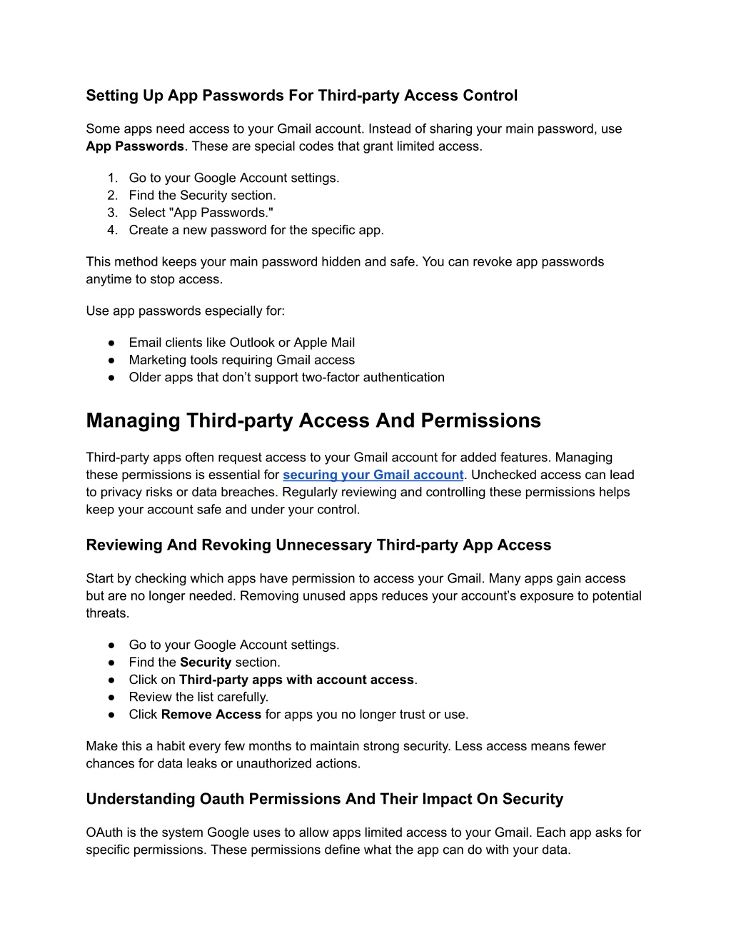 Setting Up App Passwords For Third-party Access Control Some apps need access to your Gmail account. Instead of sharing your main password, use App Passwords. These are special codes that grant limited access. 1. Go to your Google Account settings. 2. Find the Security section. 3. Select "App Passwords." 4. Create a new password for the specific app. This method keeps your main password hidden and safe. You can revoke app passwords anytime to stop access. Use app passwords especially for: ● Email clients like Outlook or Apple Mail ● Marketing tools requiring Gmail access ● Older apps that don’t support two-factor authentication Managing Third-party Access And Permissions Third-party apps often request access to your Gmail account for added features. Managing these permissions is essential for securing your Gmail account. Unchecked access can lead to privacy risks or data breaches. Regularly reviewing and controlling these permissions helps keep your account safe and under your control. Reviewing And Revoking Unnecessary Third-party App Access Start by checking which apps have permission to access your Gmail. Many apps gain access but are no longer needed. Removing unused apps reduces your account’s exposure to potential threats. ● Go to your Google Account settings. ● Find the Security section. ● Click on Third-party apps with account access. ● Review the list carefully. ● Click Remove Access for apps you no longer trust or use. Make this a habit every few months to maintain strong security. Less access means fewer chances for data leaks or unauthorized actions. Understanding Oauth Permissions And Their Impact On Security OAuth is the system Google uses to allow apps limited access to your Gmail. Each app asks for specific permissions. These permissions define what the app can do with your data.