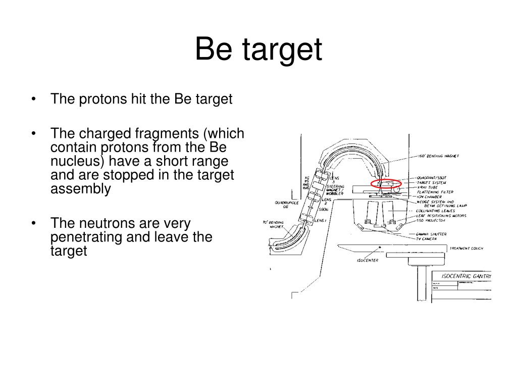 Be target • The protons hit the Be target • The charged fragments (which contain protons from the Be nucleus) have a short range and are stopped in the target assembly • The neutrons are very penetrating and leave the target