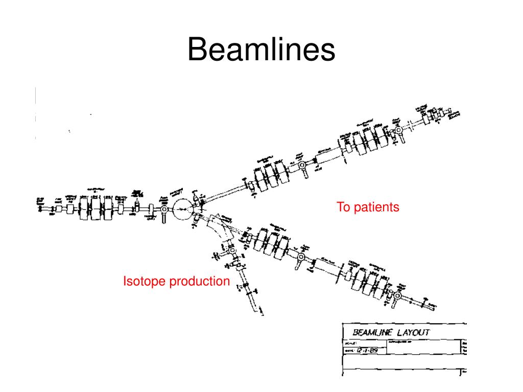 Scanditronix MC40 cyclotron Orange part is magnet yoke Wire at top is ion source Tall square columns are RF cavity tuners Extraction line with quad triplet Green things are vacuum valves