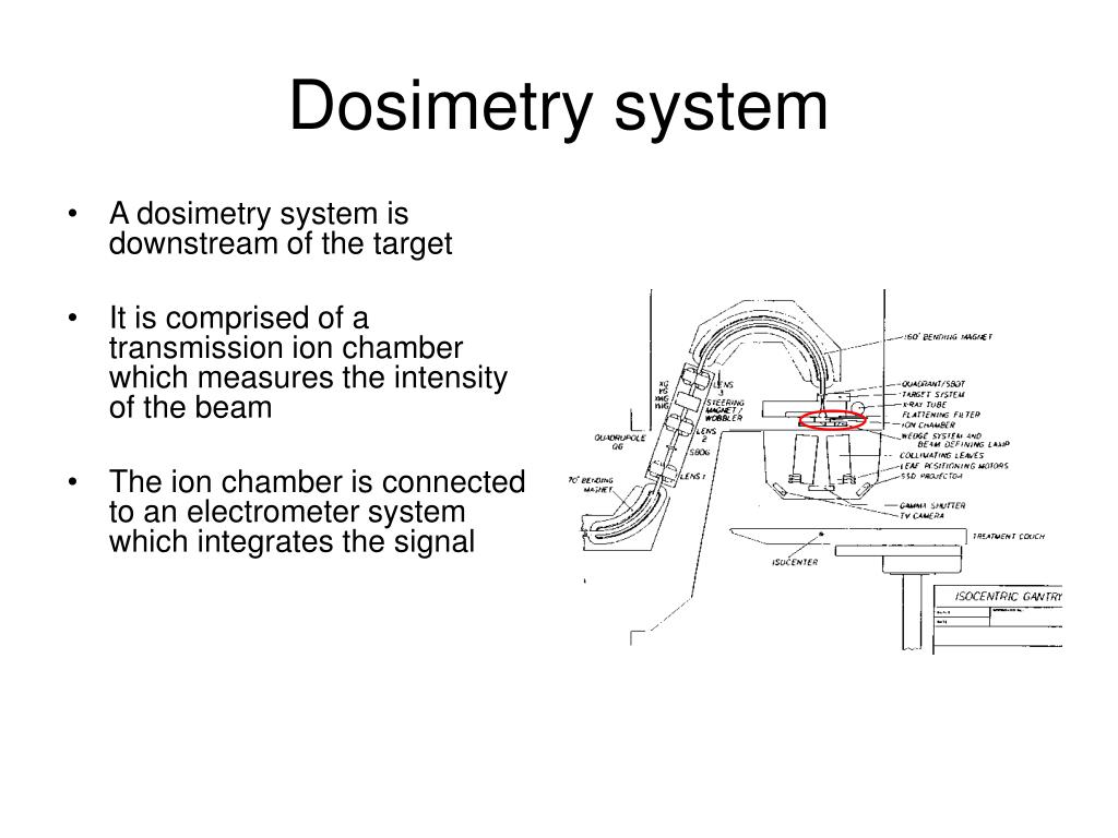 Dosimetry system • The dosimetry system is calibrated and is used to determine the dose delivered to the tumor and surrounding tissue • For safety reasons, the dosimeter system is split into two completely independent systems with dual chambers, power supplies, electrometers and means to terminate treatments