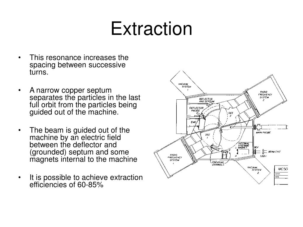 Extraction • This resonance increases the spacing between successive turns. • A narrow copper septum separates the particles in the last full orbit from the particles being guided out of the machine. • The beam is guided out of the machine by an electric field between the deflector and (grounded) septum and some magnets internal to the machine • It is possible to achieve extraction efficiencies of 60-85%
