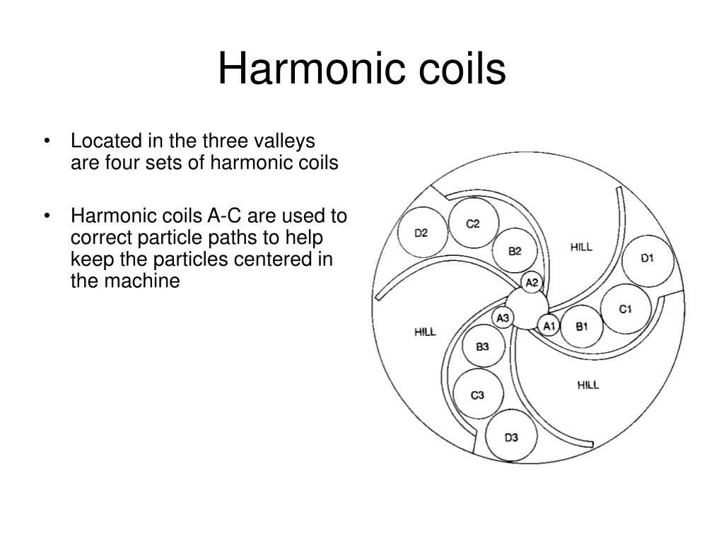 Harmonic coils • Located in the three valleys are four sets of harmonic coils • Harmonic coils A-C are used to correct particle paths to help keep the particles centered in the machine
