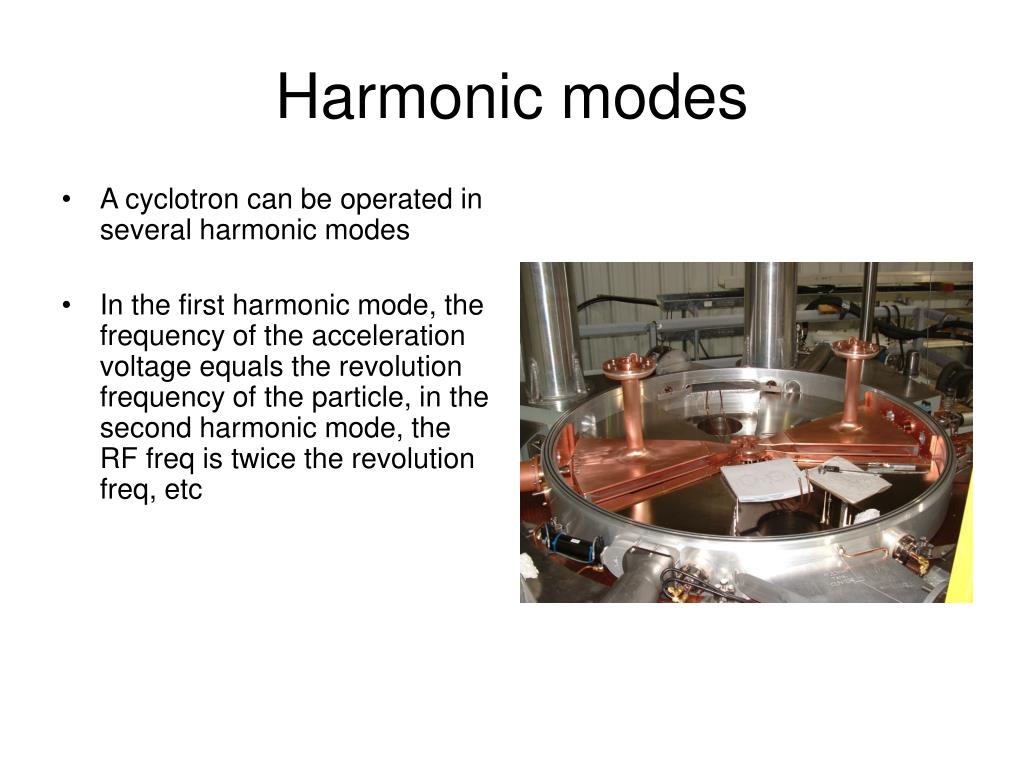 Harmonic modes • A cyclotron can be operated in several harmonic modes • In the first harmonic mode, the frequency of the acceleration voltage equals the revolution frequency of the particle, in the second harmonic mode, the RF freq is twice the revolution freq, etc