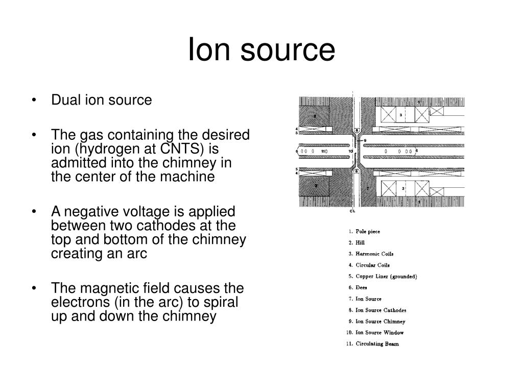 Ion source • Dual ion source • The gas containing the desired ion (hydrogen at CNTS) is admitted into the chimney in the center of the machine • A negative voltage is applied between two cathodes at the top and bottom of the chimney creating an arc • The magnetic field causes the electrons (in the arc) to spiral up and down the chimney