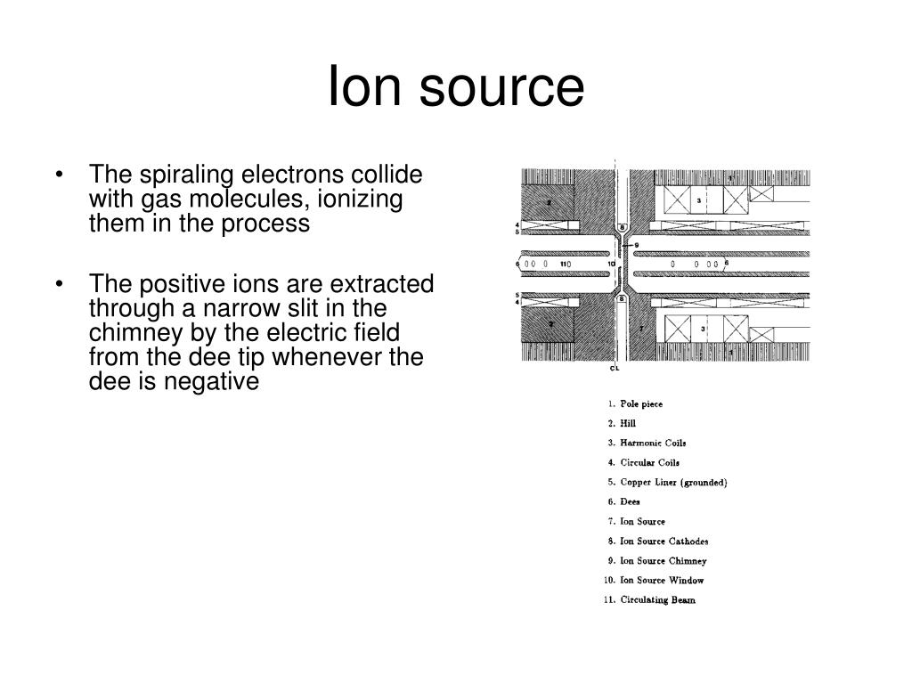 Ion source • The spiraling electrons collide with gas molecules, ionizing them in the process • The positive ions are extracted through a narrow slit in the chimney by the electric field from the dee tip whenever the dee is negative