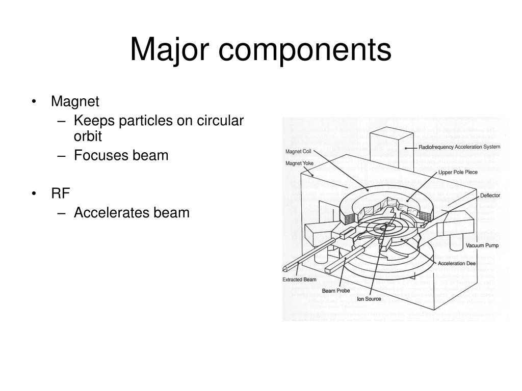 Major components • Magnet • Keeps particles on circular orbit • Focuses beam • RF • Accelerates beam