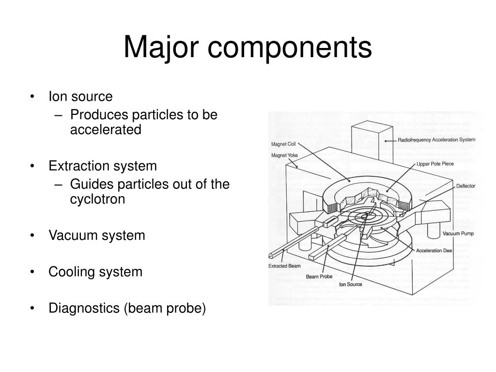 Major components • Ion source • Produces particles to be accelerated • Extraction system • Guides particles out of the cyclotron • Vacuum system • Cooling system • Diagnostics (beam probe)