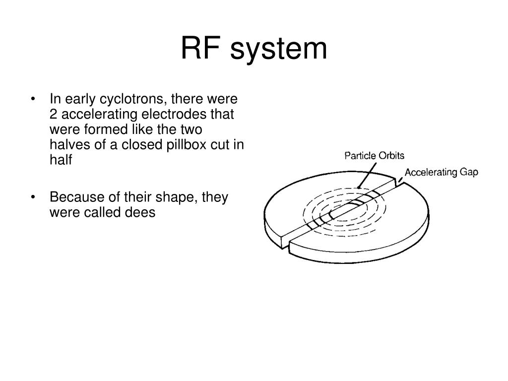 RF system • In early cyclotrons, there were 2 accelerating electrodes that were formed like the two halves of a closed pillbox cut in half • Because of their shape, they were called dees