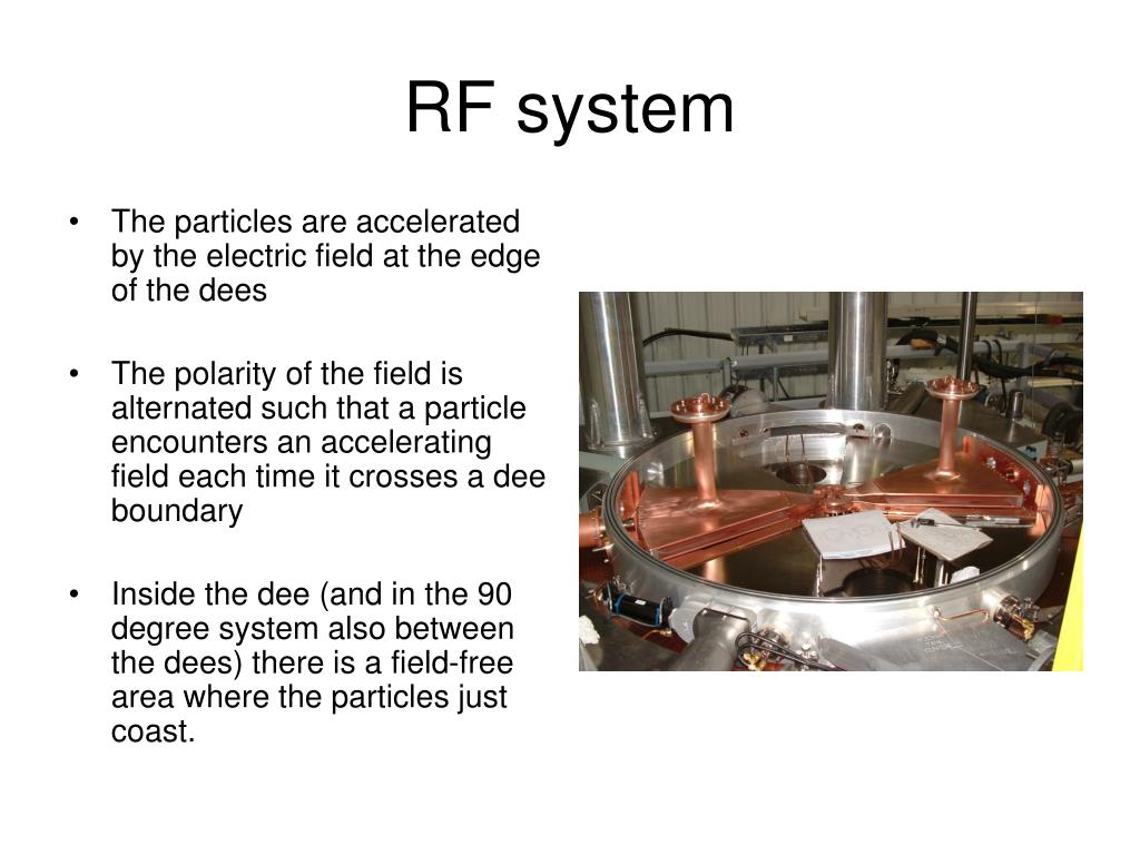 RF system • The particles are accelerated by the electric field at the edge of the dees • The polarity of the field is alternated such that a particle encounters an accelerating field each time it crosses a dee boundary • Inside the dee (and in the 90 degree system also between the dees) there is a field-free area where the particles just coast.