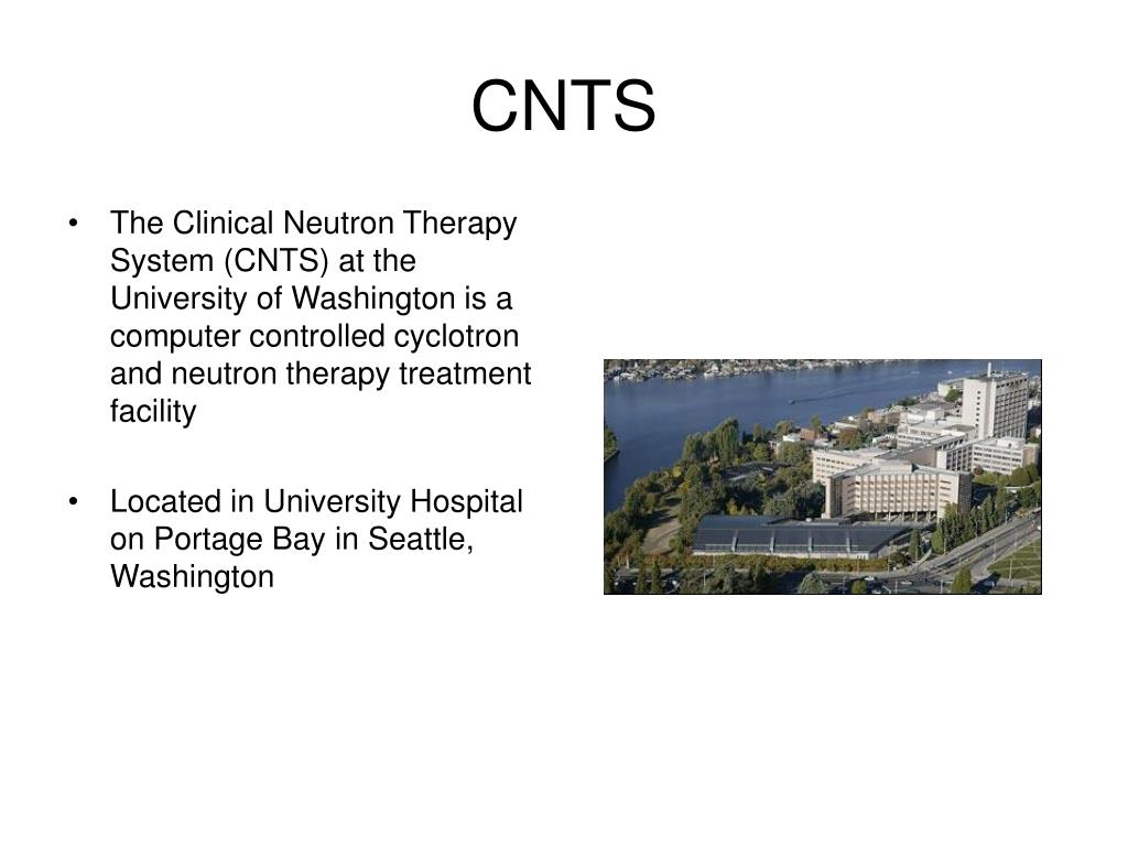 CNTS • The Clinical Neutron Therapy System (CNTS) at the University of Washington is a computer controlled cyclotron and neutron therapy treatment facility • Located in University Hospital on Portage Bay in Seattle, Washington
