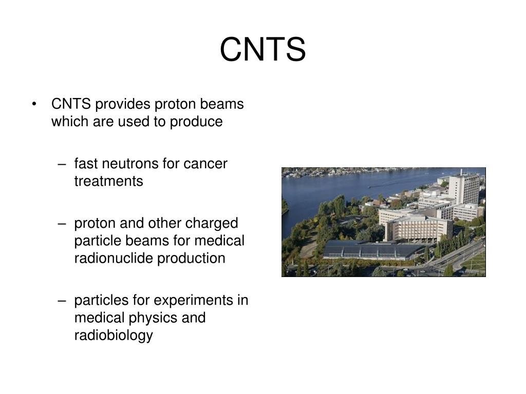 CNTS • CNTS provides proton beams which are used to produce • fast neutrons for cancer treatments • proton and other charged particle beams for medical radionuclide production • particles for experiments in medical physics and radiobiology