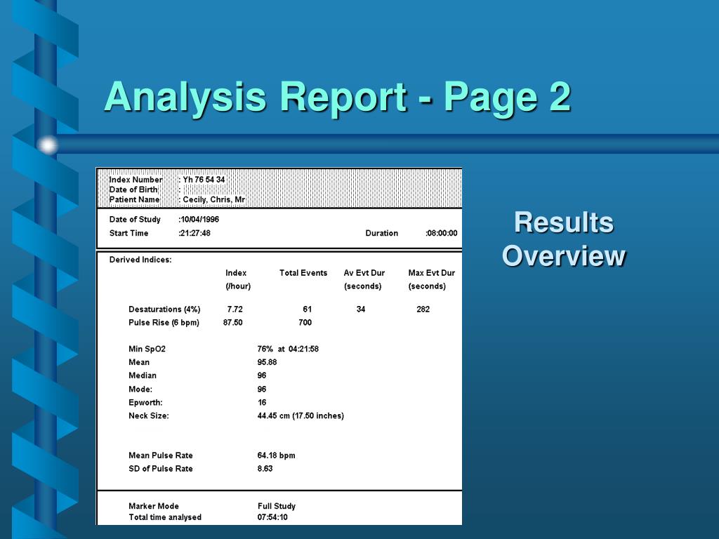 Summary Page Study & Patient Details: - Name - Address - Ht, Wt, Neck Size - Epworth, BMI etc Comments can be entered from the keyboard Analysis Report - Page 1