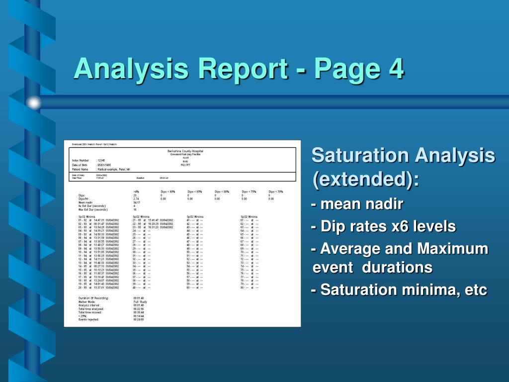 Saturation Analysis (extended): - mean nadir - Dip rates x6 levels - Average and Maximum event durations - Saturation minima, etc Analysis Report - Page 4