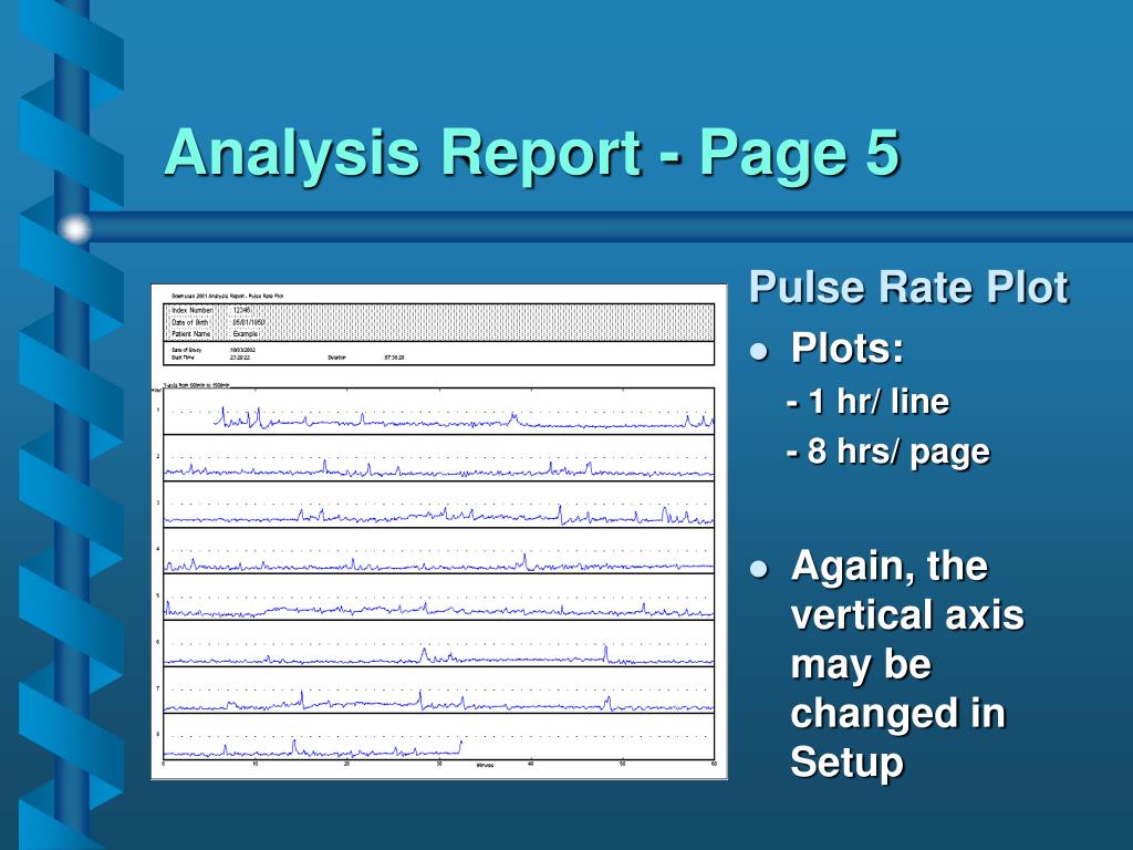 Pulse Rate Plot Plots: - 1 hr/ line - 8 hrs/ page Again, the vertical axis may be changed in Setup Analysis Report - Page 5