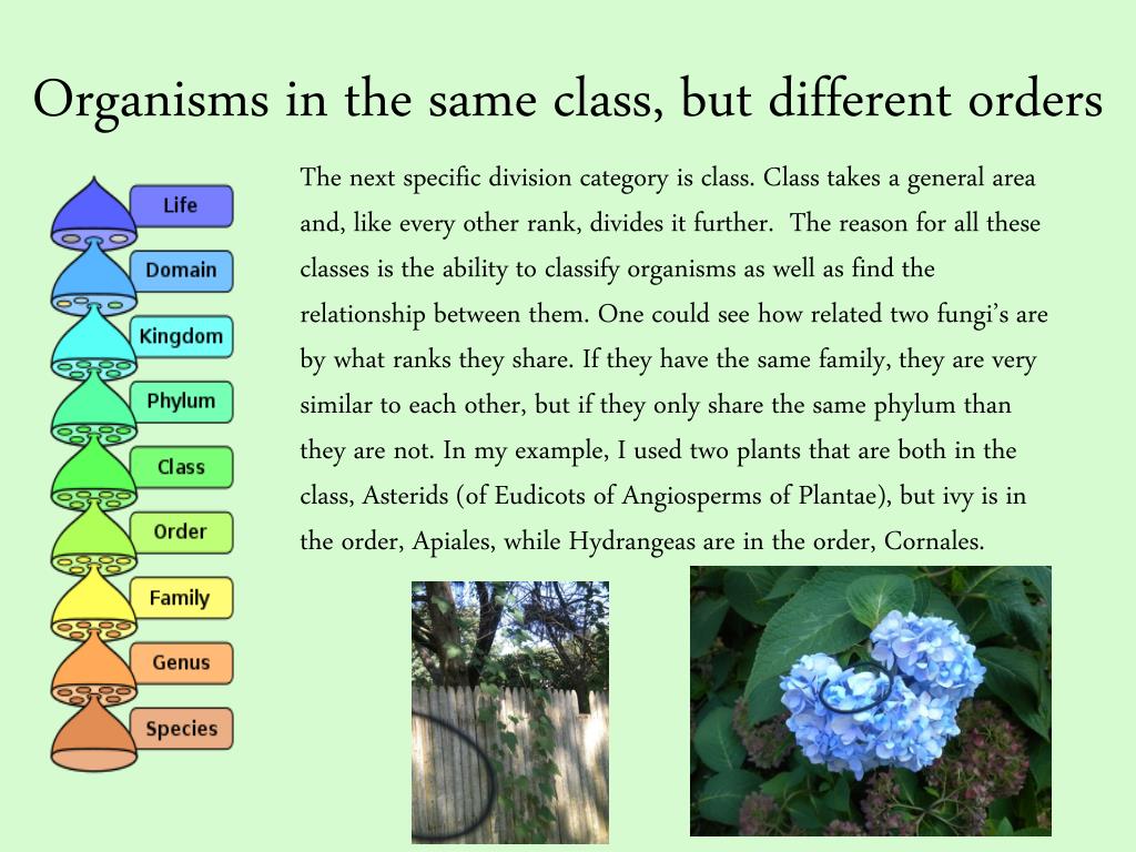 Organisms in the same class, but different orders The next specific division category is class. Class takes a general area and, like every other rank, divides it further. The reason for all these classes is the ability to classify organisms as well as find the relationship between them. One could see how related two fungi’s are by what ranks they share. If they have the same family, they are very similar to each other, but if they only share the same phylum than they are not. In my example, I used two plants that are both in the class, Asterids(of Eudicots of Angiosperms of Plantae), but ivy is in the order, Apiales, while Hydrangeas are in the order, Cornales.