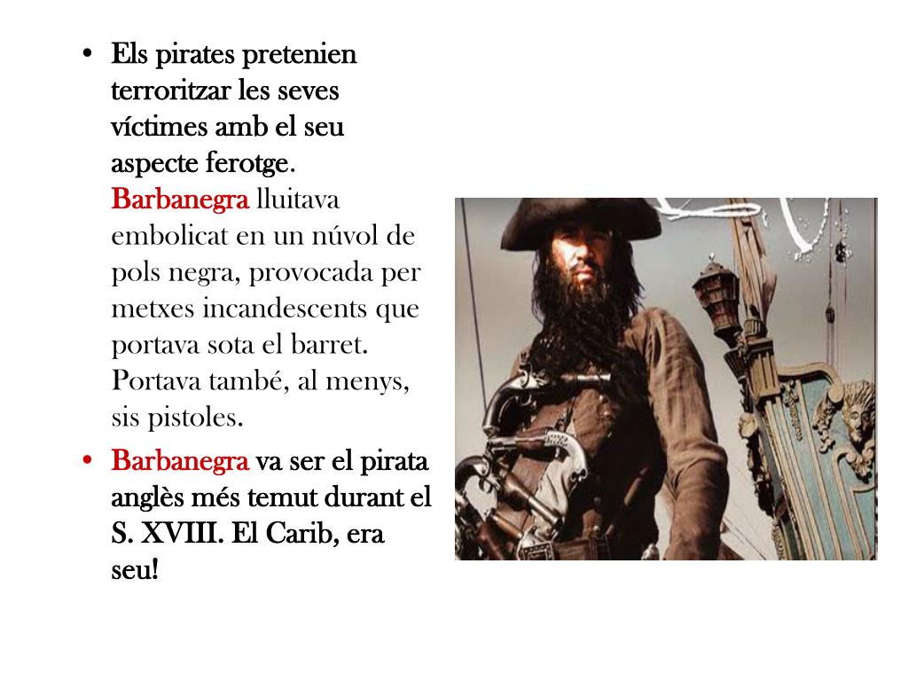 Els pirates pretenien terroritzar les seves víctimes amb el seu aspecte ferotge. Barbanegralluitava embolicat en un núvol de pols negra, provocada per metxes incandescents que portava sota el barret. Portava també, al menys, sis pistoles. • Barbanegra va ser el pirata anglès més temut durant el S. XVIII. El Carib, era seu!