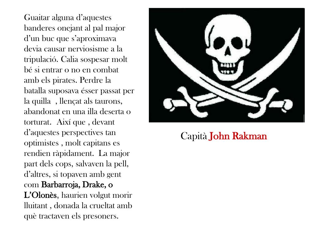 Guaitar alguna d’aquestes banderes onejant al pal major d’un buc que s’aproximava devia causar nerviosisme a la tripulació. Calia sospesar molt bé si entrar o no en combat amb els pirates. Perdre la batalla suposava ésser passat per la quilla , llençat als taurons, abandonat en una illa deserta o torturat. Així que , devant d’aquestes perspectives tan optimistes , molt capitans es rendien ràpidament. La major part dels cops, salvaven la pell, d’altres, si topaven amb gent com Barbarroja, Drake, o L’Olonès, haurien volgut morir lluitant , donada la crueltat amb què tractaven els presoners. Capità John Rakman