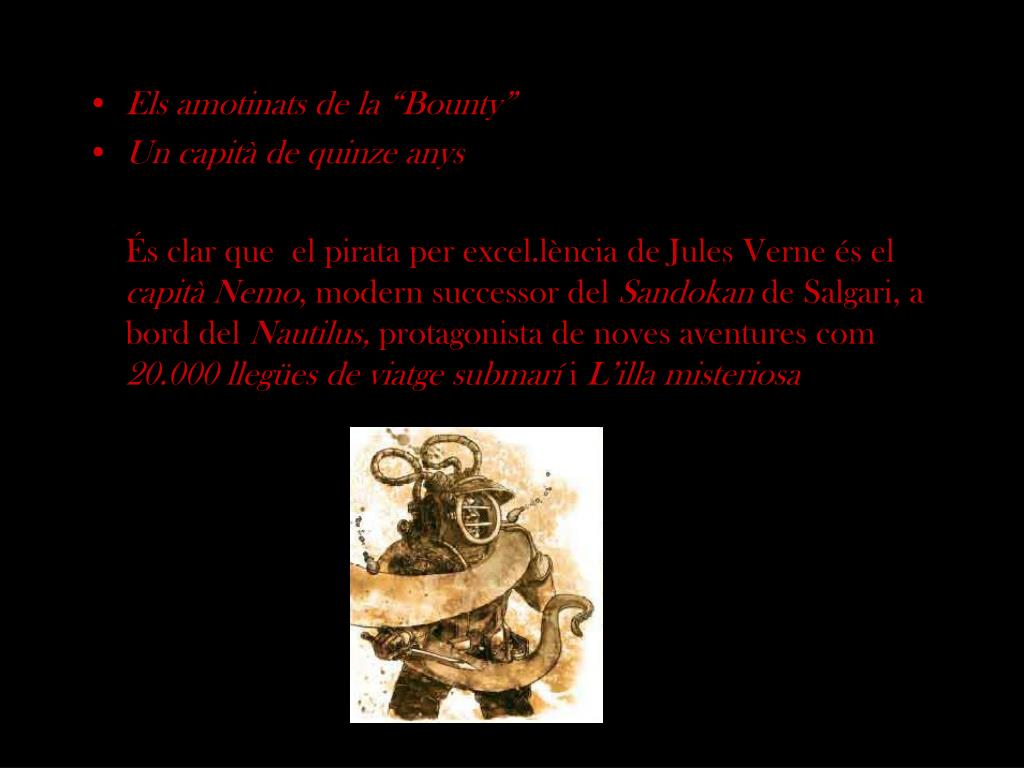 Els amotinats de la “Bounty” • Un capità de quinze anys És clar que el pirata per excel.lència de Jules Verne és el capità Nemo, modern successor del Sandokan de Salgari, a bord del Nautilus, protagonista de noves aventures com 20.000 llegües de viatge submarí i L’illa misteriosa