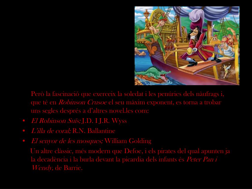 Però la fascinació que exerceix la soledat i les penúries dels nàufrags i, que té en Robinson Crusoe el seu màxim exponent, es torna a trobar uns segles després a d’altres novel.les com: • El Robinson Suïs; J.D. I J.R. Wyss • L’illa de coral; R.N. Ballantine • El senyor de les mosques; William Golding Un altre clàssic, més modern que Defoe, i els pirates del qual apunten ja la decadència i la burla devant la picardia dels infants és Peter Pan i Wendy, de Barrie.