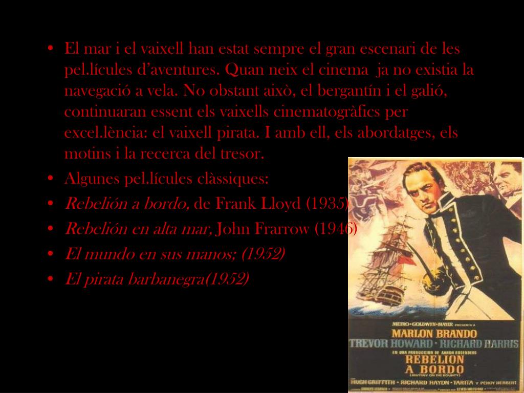 El mar i el vaixell han estat sempre el gran escenari de les pel.lícules d’aventures. Quan neix el cinema ja no existia la navegació a vela. No obstant això, el bergantín i el galió, continuaran essent els vaixells cinematogràfics per excel.lència: el vaixell pirata. I amb ell, els abordatges, els motins i la recerca del tresor. • Algunes pel.lícules clàssiques: • Rebelión a bordo, de Frank Lloyd (1935) • Rebelión en alta mar, John Frarrow (1946) • El mundo en sus manos; (1952) • El pirata barbanegra(1952)