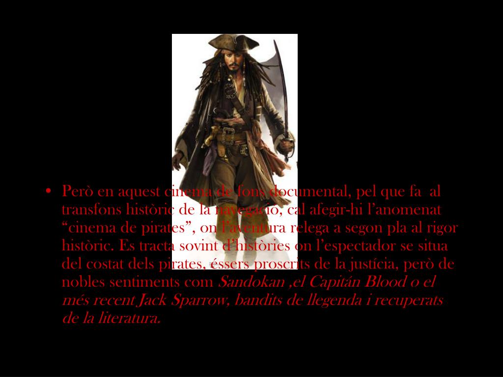 Però en aquest cinema de fons documental, pel que fa al transfons històric de la navegació, cal afegir-hi l’anomenat “cinema de pirates”, on l’aventura relega a segon pla al rigor històric. Es tracta sovint d’històries on l’espectador se situa del costat dels pirates, éssers proscrits de la justícia, però de nobles sentiments com Sandokan ,el Capitán Blood o el més recent Jack Sparrow, bandits de llegenda i recuperats de la literatura.