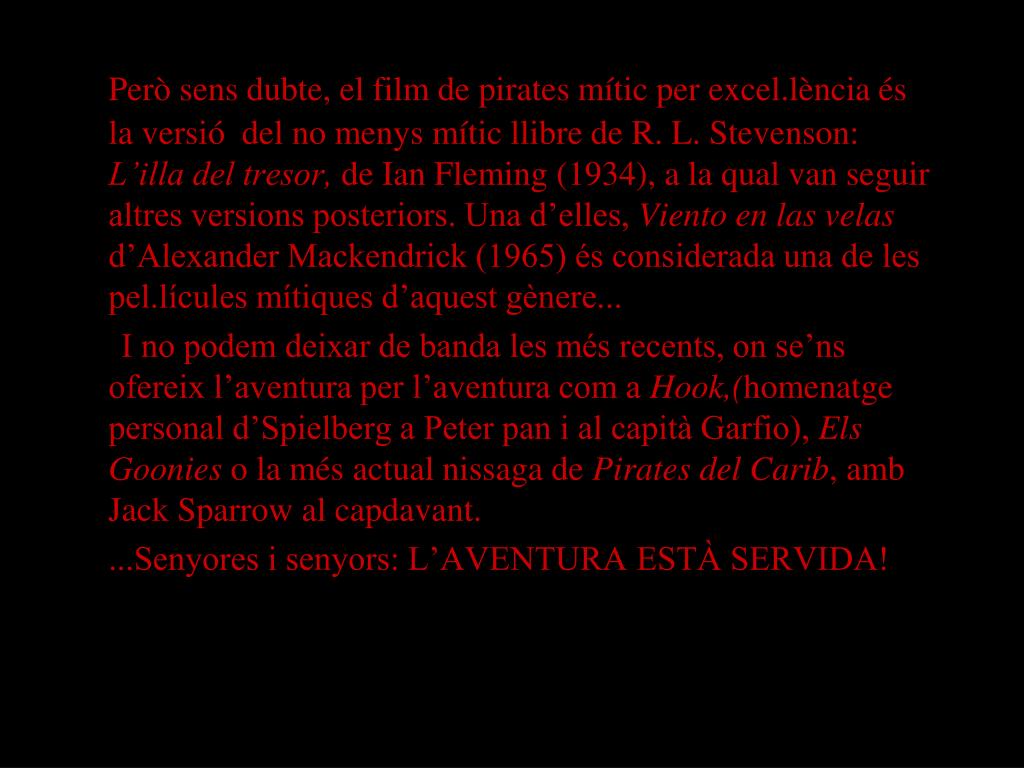 Però sens dubte, el film de pirates mític per excel.lència és la versió del no menys mític llibre de R. L. Stevenson: L’illa del tresor, de Ian Fleming (1934), a la qual van seguir altres versions posteriors. Una d’elles, Viento en las velas d’Alexander Mackendrick (1965) és considerada una de les pel.lícules mítiques d’aquest gènere... I no podem deixar de banda les més recents, on se’ns ofereix l’aventura per l’aventura com a Hook,(homenatge personal d’Spielberg a Peter pan i al capità Garfio), Els Goonies o la més actual nissaga de Pirates del Carib, amb Jack Sparrow al capdavant. ...Senyores i senyors: L’AVENTURA ESTÀ SERVIDA!