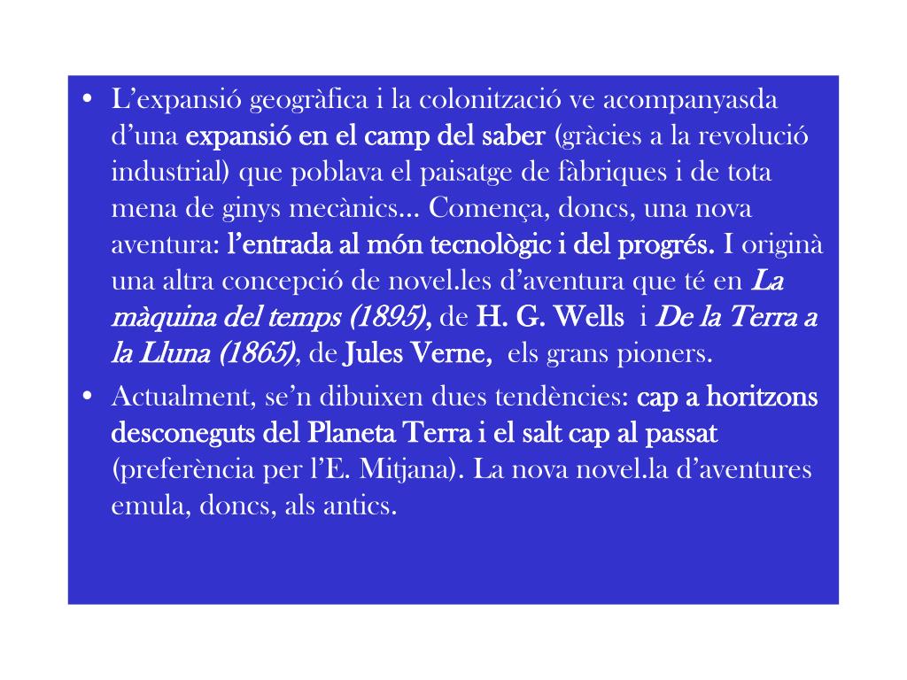 L’expansió geogràfica i la colonització ve acompanyasda d’una expansió en el camp del saber (gràcies a la revolució industrial) que poblava el paisatge de fàbriques i de tota mena de ginys mecànics... Comença, doncs, una nova aventura: l’entrada al món tecnològic i del progrés. I originà una altra concepció de novel.les d’aventura que té en La màquina del temps (1895), de H. G. Wells i De la Terra a la Lluna (1865), de Jules Verne, els grans pioners. • Actualment, se’n dibuixen dues tendències: cap a horitzons desconeguts del Planeta Terra i el salt cap al passat (preferència per l’E. Mitjana). La nova novel.la d’aventures emula, doncs, als antics.
