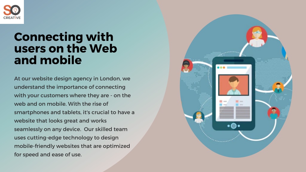 Connecting with users on the Web and mobile At our website design agency in London, we understand the importance of connecting with your customers where they are - on the web and on mobile. With the rise of smartphones and tablets, it's crucial to have a website that looks great and works seamlessly on any device. Our skilled team uses cutting-edge technology to design mobile-friendly websites that are optimized for speed and ease of use.