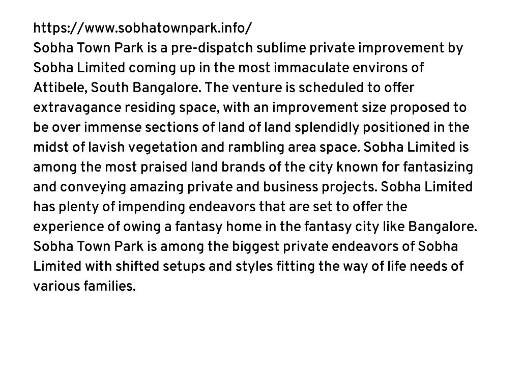 https://www.sobhatownpark.info/<br>Sobha Town Park is a pre-dispatch sublime private improvement by Sobha Limited coming up in the most immaculate environs of Attibele, South Bangalore. The venture is scheduled to offer extravagance residing space, with an improvement size proposed to be over immense sections of land of land splendidly positioned in the midst of lavish vegetation and rambling area space. Sobha Limited is among the most praised land brands of the city known for fantasizing and conveying amazing private and business projects. Sobha Limited has plenty of impending endeavors that are set to offer the experience of owing a fantasy home in the fantasy city like Bangalore. Sobha Town Park is among the biggest private endeavors of Sobha Limited with shifted setups and styles fitting the way of life needs of various families. <br><br>With the developing interest in the city for private areas, engineers are offering wide reach private choices for the expected home searchers. Financial backers get reasonable homes with hosts of conveniences and offices to improve your expectations for everyday comforts as well as the simplicity of residing. The task is relaxed across tremendous sections of land of land space with various designs and unit sizes, with signature relaxation and sporting conveniences and offices. Sobha Town Park is to be sure an adept venture opportunity for every one of the individuals who are currently buying a fantasy home that should not be underestimated and it is for sure worth considering for any likely financial backer, searching for homes in the promising rural areas of South Bangalore. <br><br>The extravagance homesteads at Sobha Town Park are created with a state of the art planners and exceptionally imaginative scene experts containing a gathering of gifted and very talented experts. The Project targets coordinating with the prerequisite of a home you had always wanted obliging all the extravagance necessities. Each and every installation and the determination at home are examined and picked with extreme attention to detail. As the new dispatch of Sobha Town Park is reported, unquestionably awesome of private residing space is set to be conveyed to home searchers making it the most planned speculations of the city. <br>