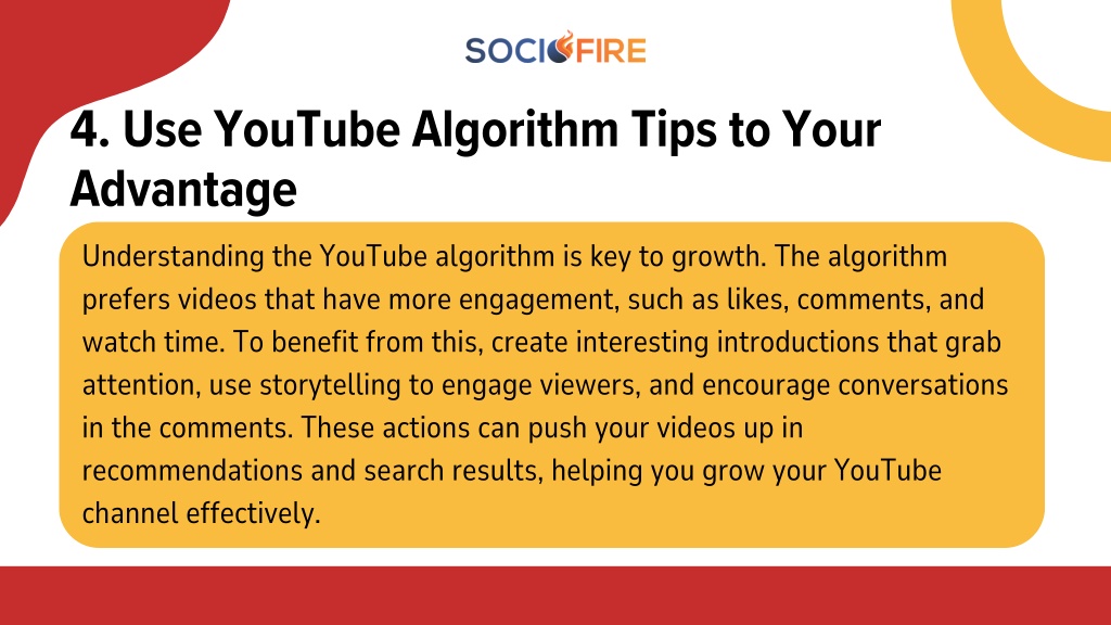 4. Use YouTube Algorithm Tips to Your Advantage Understanding the YouTube algorithm is key to growth. The algorithm prefers videos that have more engagement, such as likes, comments, and watch time. To benefit from this, create interesting introductions that grab attention, use storytelling to engage viewers, and encourage conversations in the comments. These actions can push your videos up in recommendations and search results, helping you grow your YouTube channel effectively.