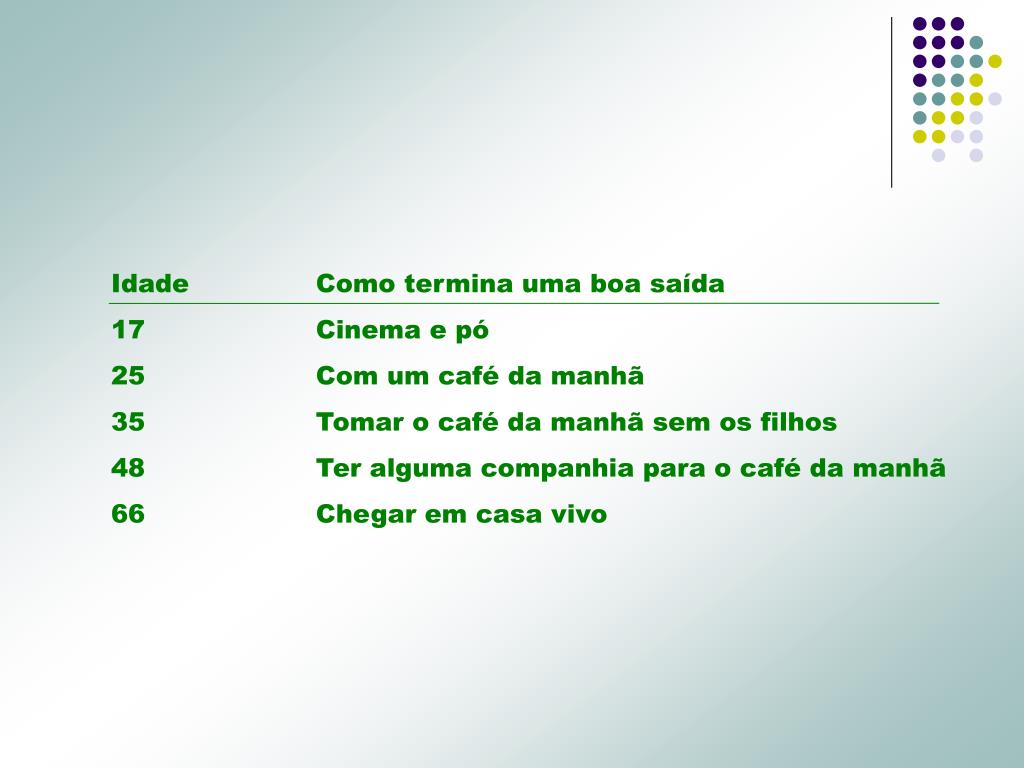 Idade Como termina uma boa saída 17 Cinema e pó 25 Com um café da manhã 35 Tomar o café da manhã sem os filhos 48 Ter alguma companhia para o café da manhã 66 Chegar em casa vivo