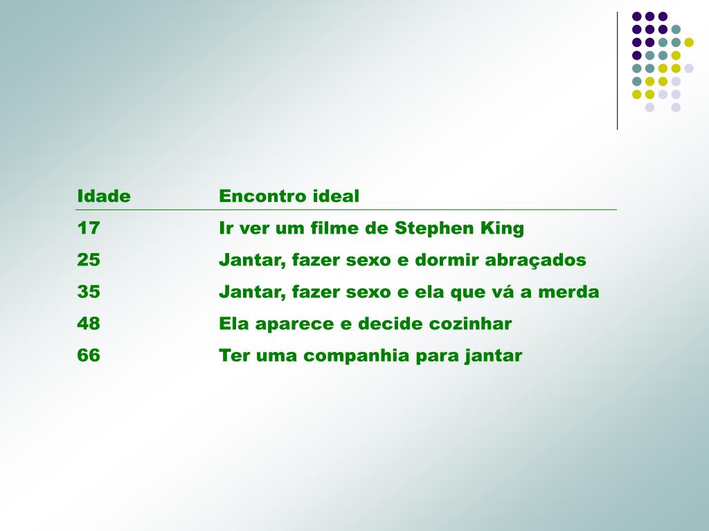 Idade Encontro ideal 17 Ir ver um filme de Stephen King 25 Jantar, fazer sexo e dormir abraçados 35 Jantar, fazer sexo e ela que vá a merda 48 Ela aparece e decide cozinhar 66 Ter uma companhia para jantar