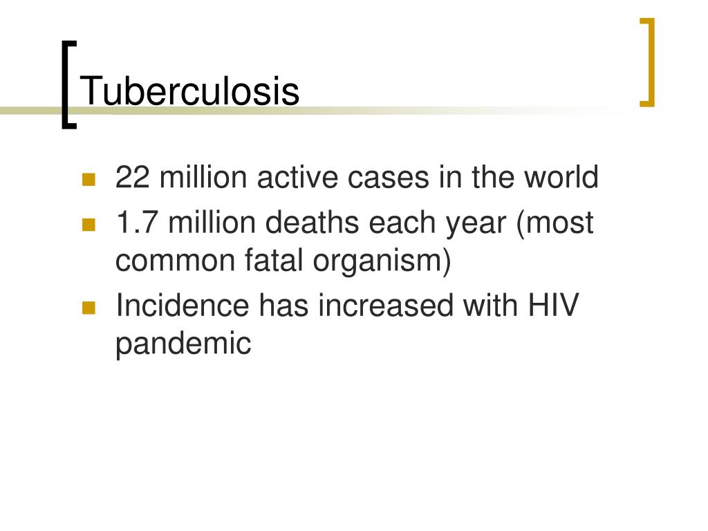 Tuberculosis • 22 million active cases in the world • 1.7 million deaths each year (most common fatal organism) • Incidence has increased with HIV pandemic