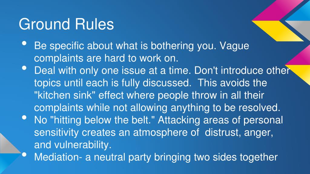 Ground Rules • Be specific about what is bothering you. Vague complaints are hard to work on. • Deal with only one issue at a time. Don't introduce other topics until each is fully discussed. This avoids the "kitchen sink" effect where people throw in all their complaints while not allowing anything to be resolved. • No "hitting below the belt." Attacking areas of personal sensitivity creates an atmosphere of distrust, anger, and vulnerability. • Mediation- a neutral party bringing two sides together