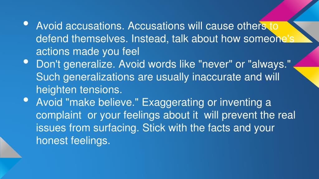 Avoid accusations. Accusations will cause others to defend themselves. Instead, talk about how someone's actions made you feel • Don't generalize. Avoid words like "never" or "always." Such generalizations are usually inaccurate and will heighten tensions. • Avoid "make believe." Exaggerating or inventing a complaint or your feelings about it will prevent the real issues from surfacing. Stick with the facts and your honest feelings.