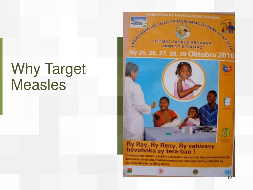 Measles is… • One of the top five causes of vaccine preventable deaths in the world. • One of the most contagious diseases; 90% of those without immunity will quickly contract measles when exposed to the virus. • Easy to prevent – the vaccine costs less than US$1. Why Target Measles?