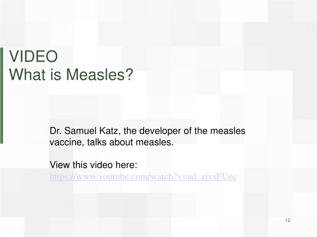 VIDEO What is Measles? Dr. Samuel Katz, the developer of the measles vaccine, talks about measles. View this video here: https://www.youtube.com/watch?v=ad_zjxsFUec